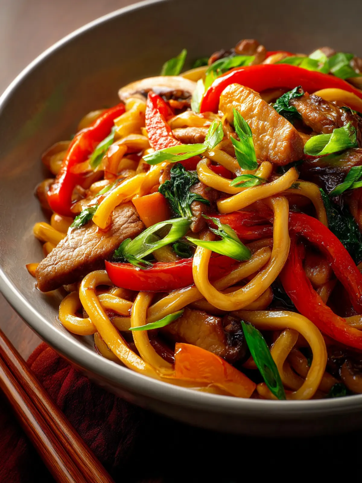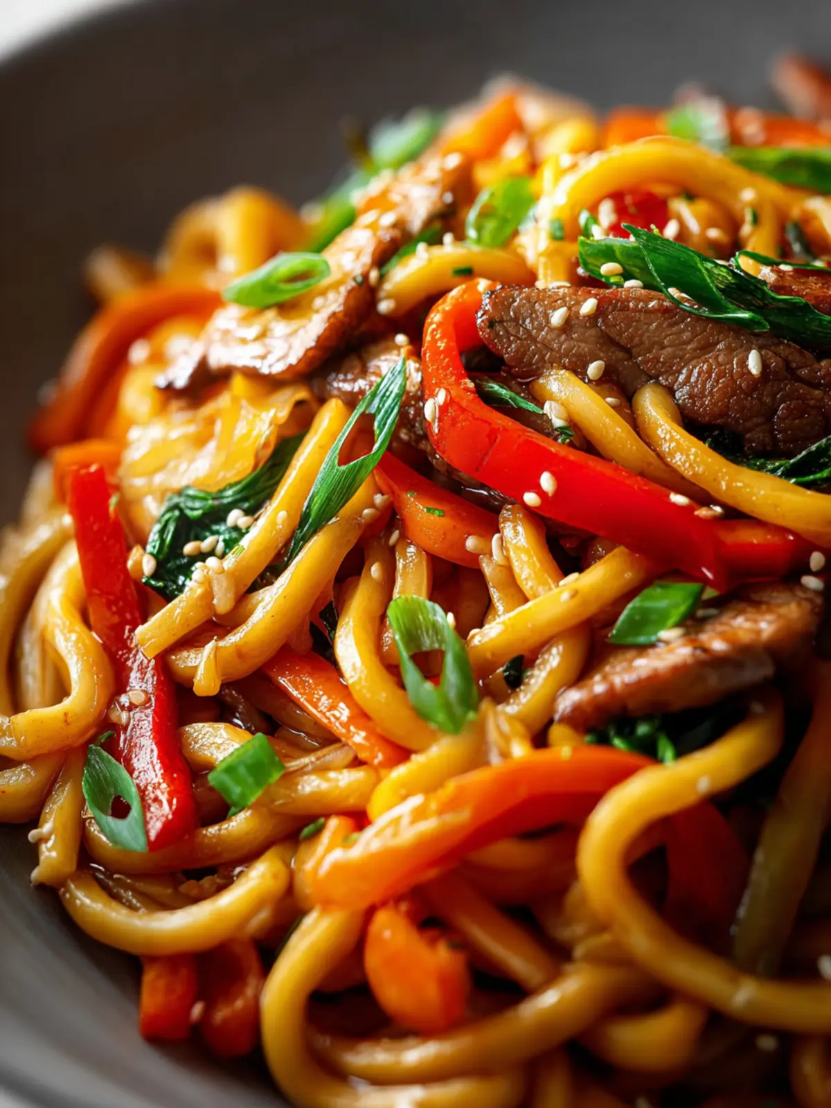 A comforting and flavorful stir-fried noodle dish featuring udon noodles, thinly sliced beef, and a variety of colorful vegetables.