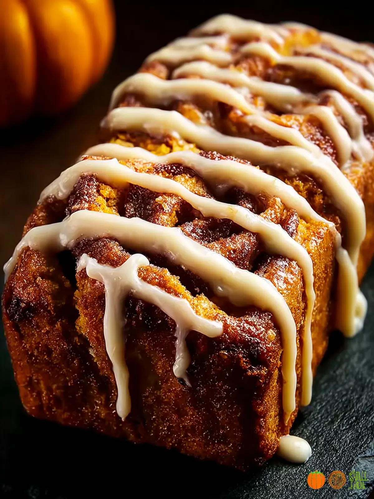 Deliciously moist pumpkin bread topped with a creamy glaze.