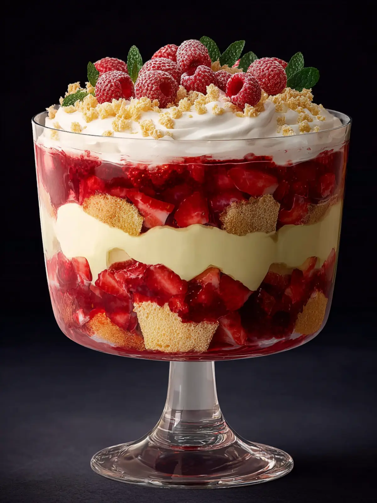A delightful trifle made with fresh raspberries, strawberries, and a rich custard, topped with cream and flaked almonds.