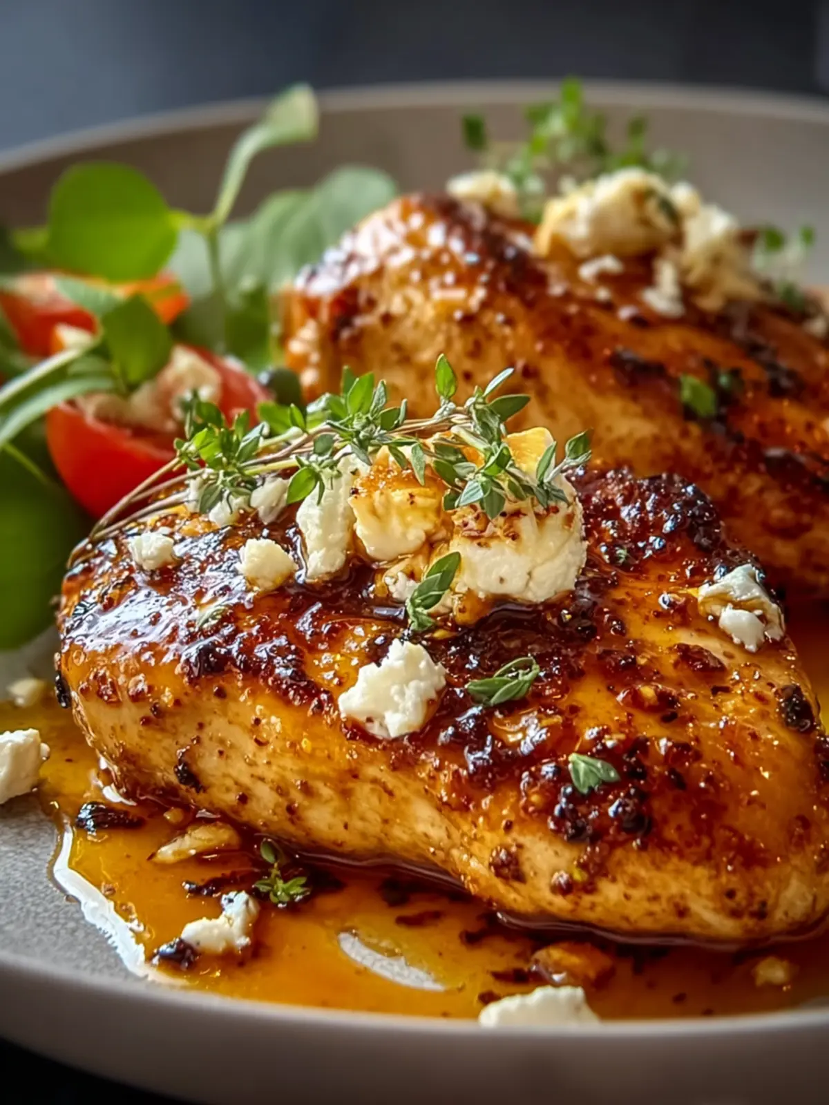 Deliciously seared chicken breasts coated with a sweet and spicy honey glaze, topped with feta cheese and fresh thyme.