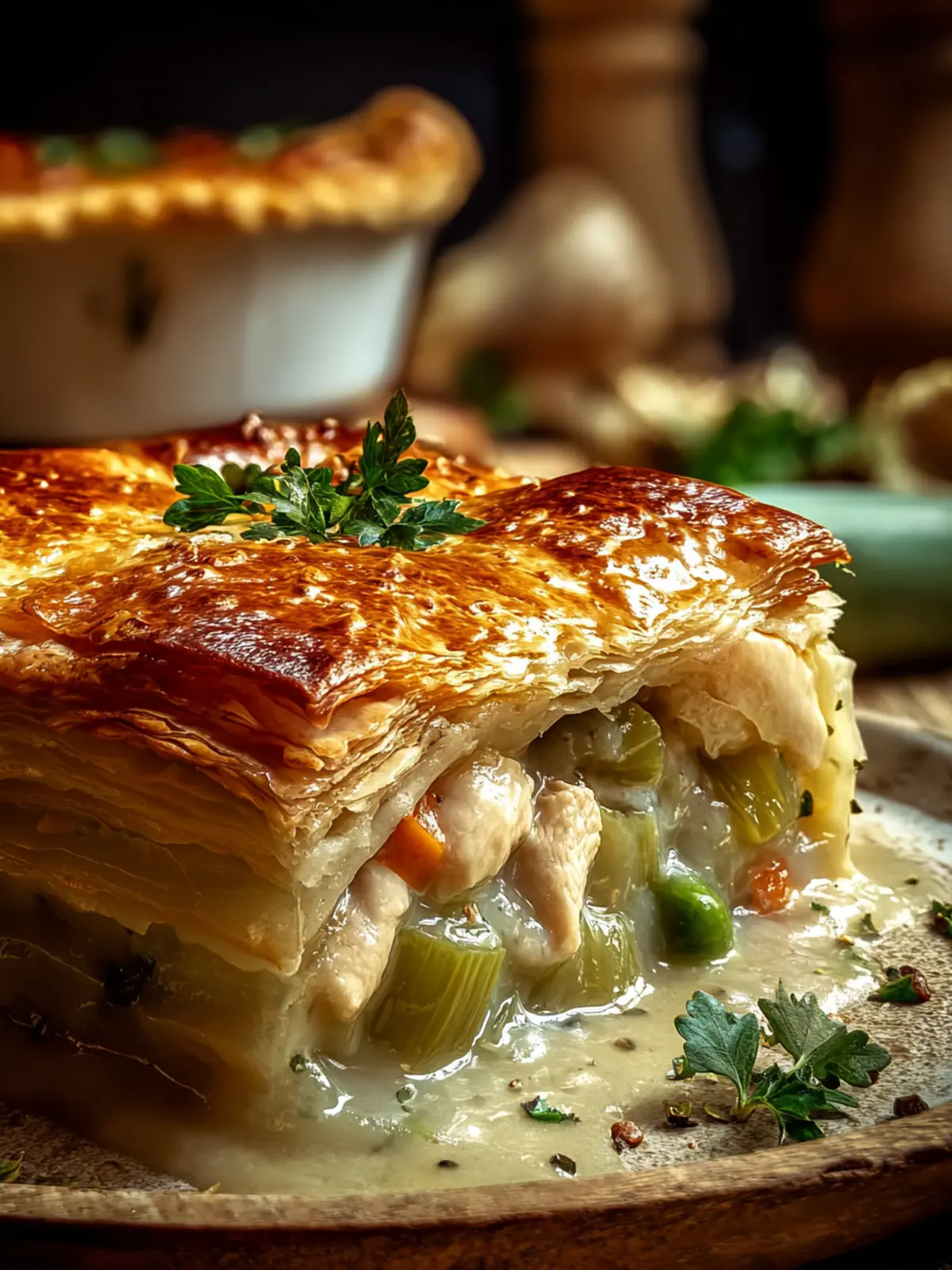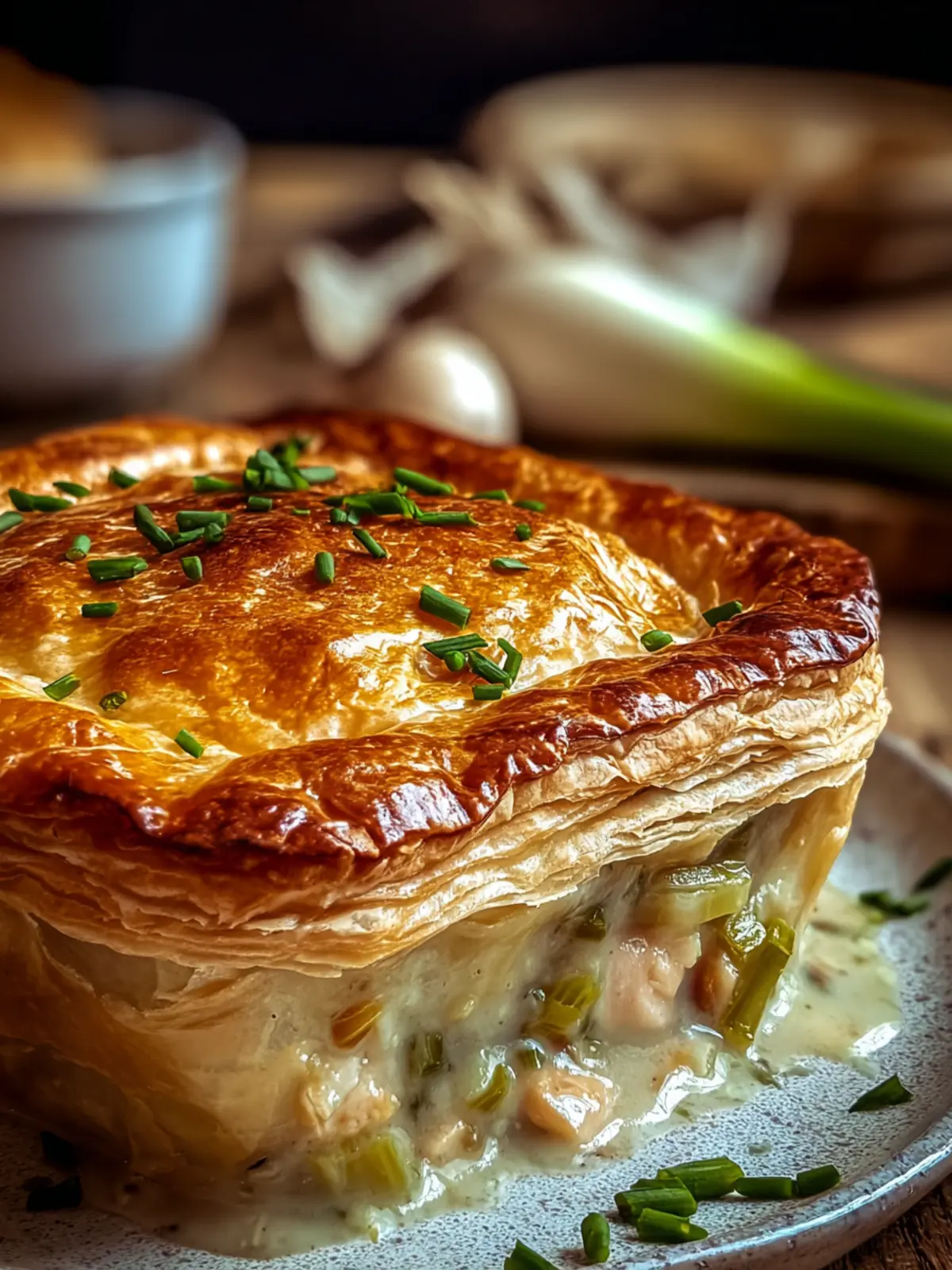 Rich, Savory Filling: The combination of tender chicken and robust leeks blended in a creamy sauce creates a filling that’s bursting with flavor. Each slice is a testament to the magic of simple ingredients coming together.