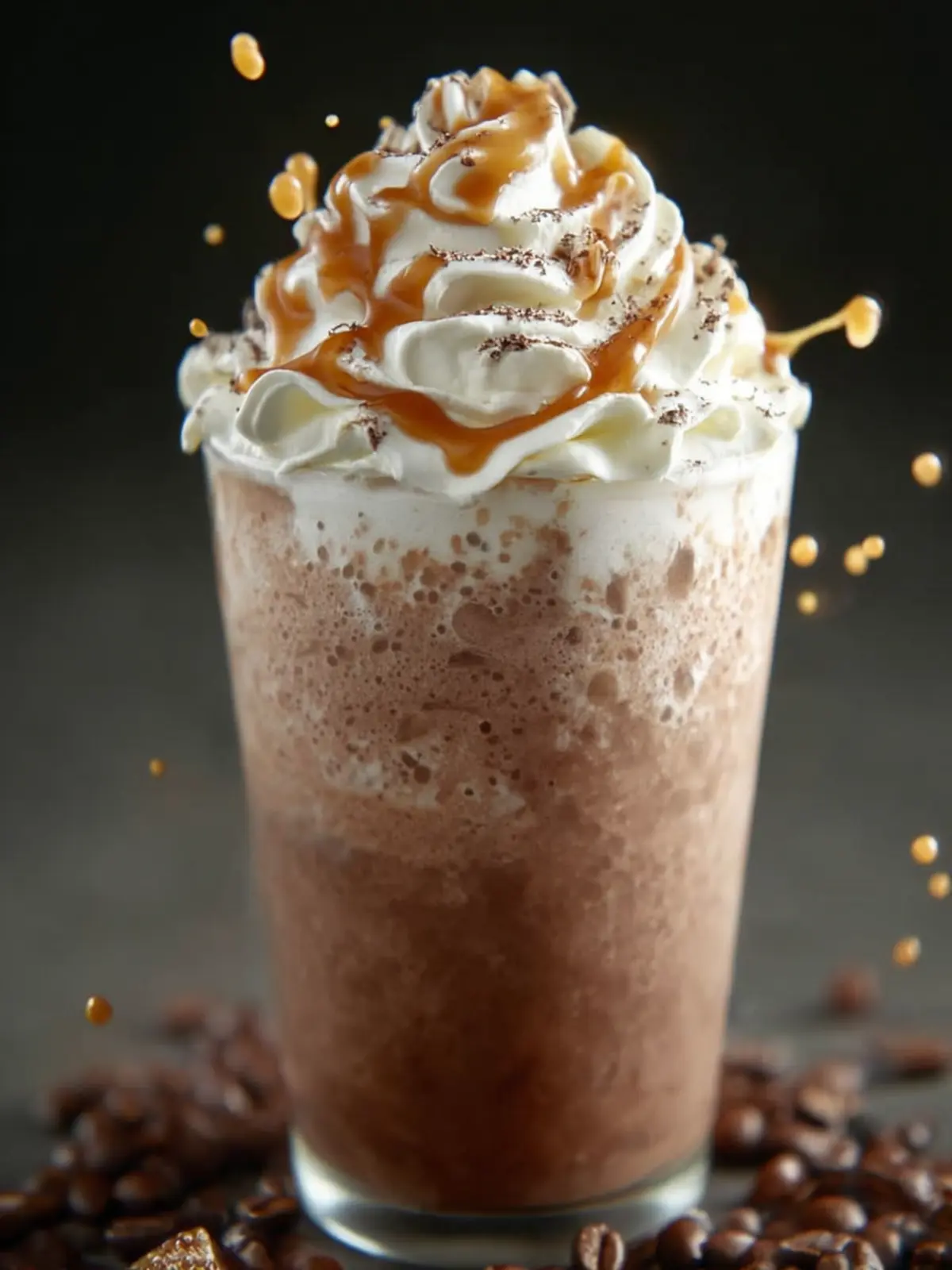 - Transfer to two tall glasses and top with whipped cream and drizzle with caramel sauce.