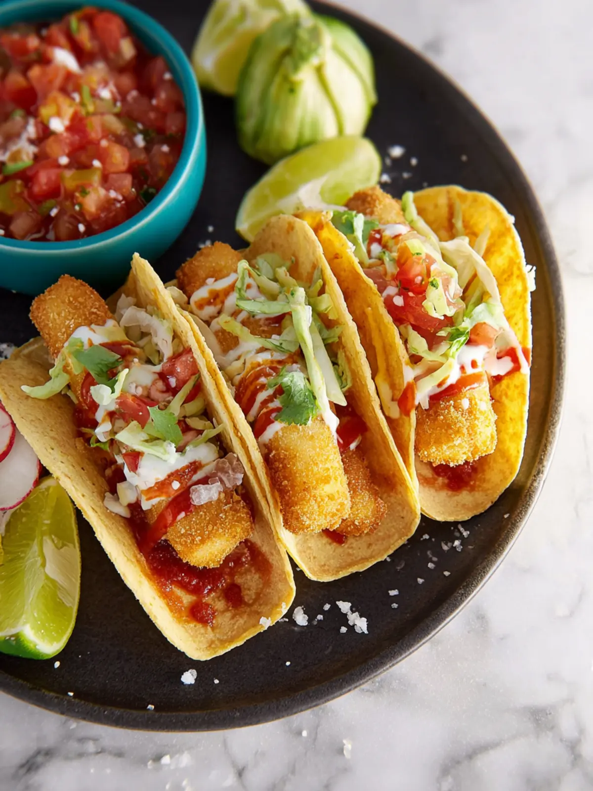 The star of the show, the fish sticks, bring a crispy texture that pairs wonderfully with fresh toppings. You can customize each taco just the way you like it, layering on ingredients that make your taste buds sing. Whether you want to pile on fresh cabbage, tangy lime, or zesty salsa, the choice is yours. Plus, they’re an instant hit with both friends and little ones alike, making them a versatile option for gatherings or family dinners.