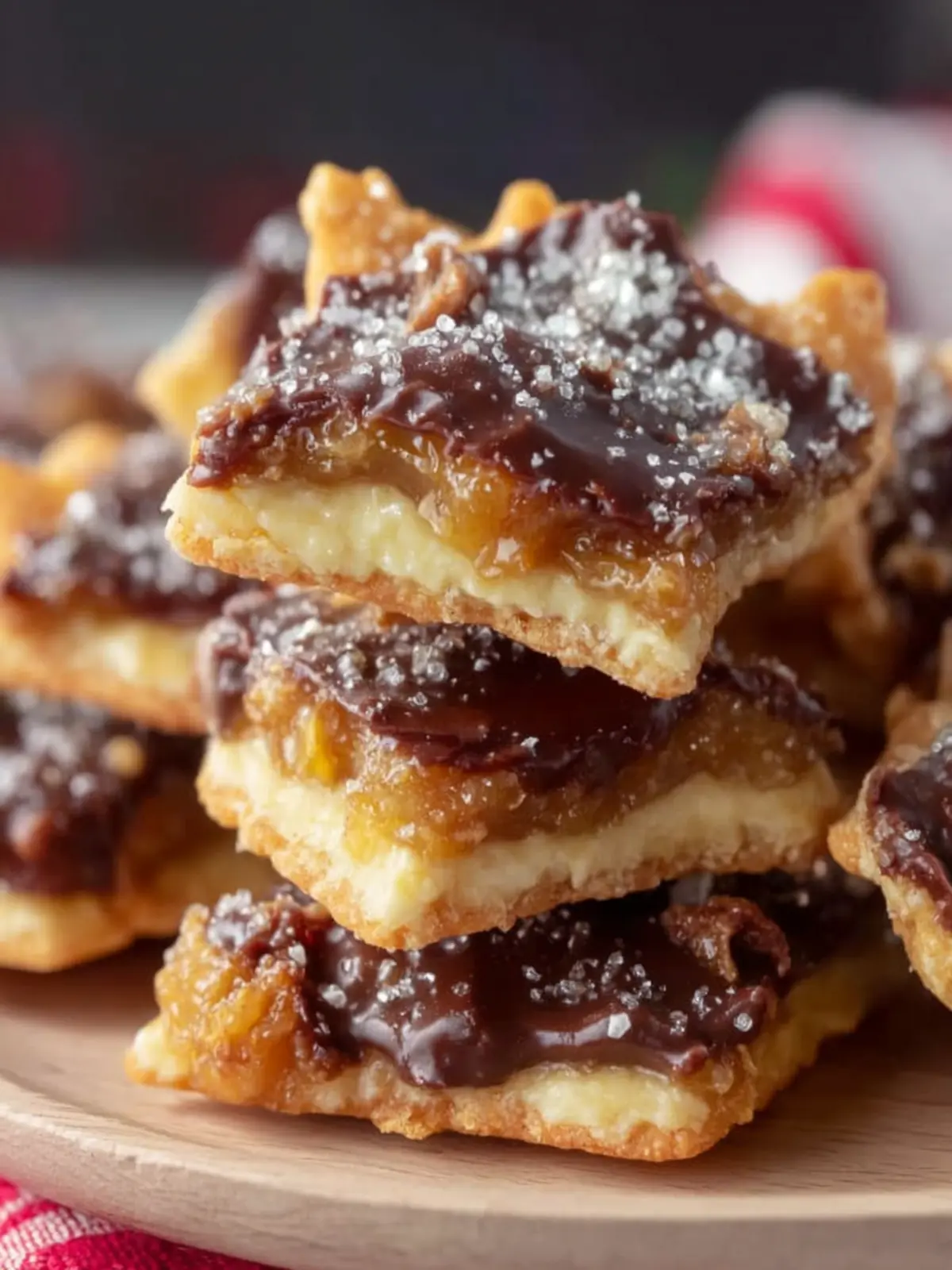 A delicious dessert made with Ritz crackers, chocolate, and caramel.