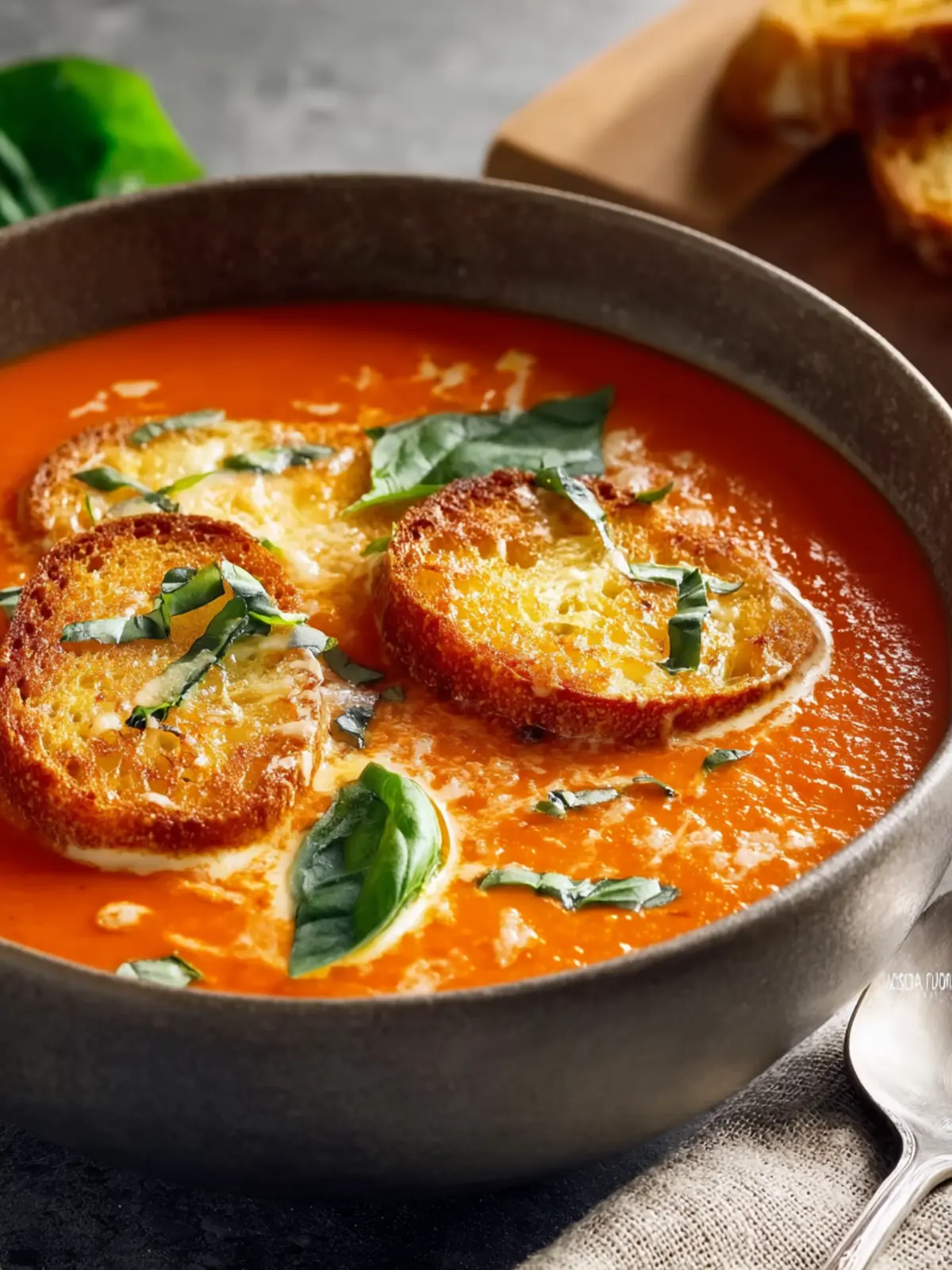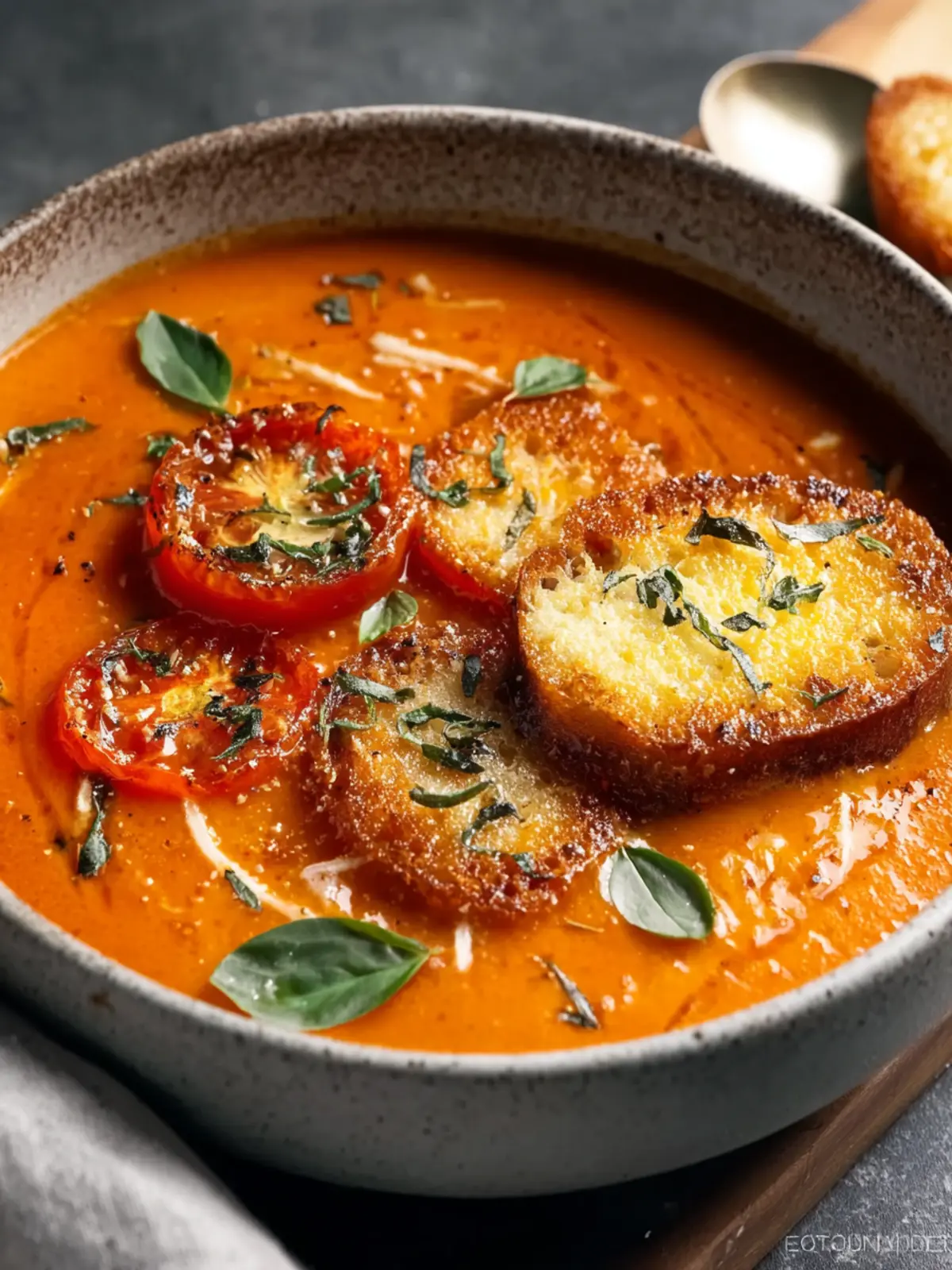 A comforting and delicious roasted tomato soup, perfect for any occasion, enhanced with cheesy toasts.