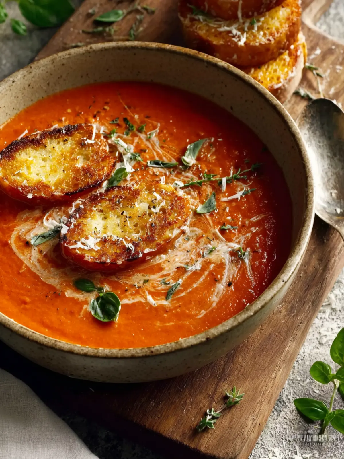 Herbs: Fresh basil brings an aromatic touch that pairs excellently with tomatoes, while a hint of thyme adds earthiness. Together, they create a fragrant and inviting bowl of soup.