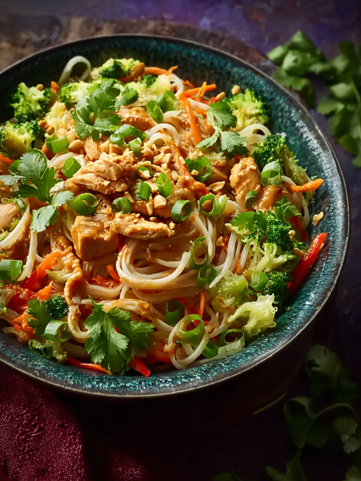- Divide the cooked noodles between serving bowls. Top each portion with the chicken and vegetable mixture. Drizzle generously with peanut sauce, then sprinkle green onions and chopped cilantro over the top. Serve immediately while warm.